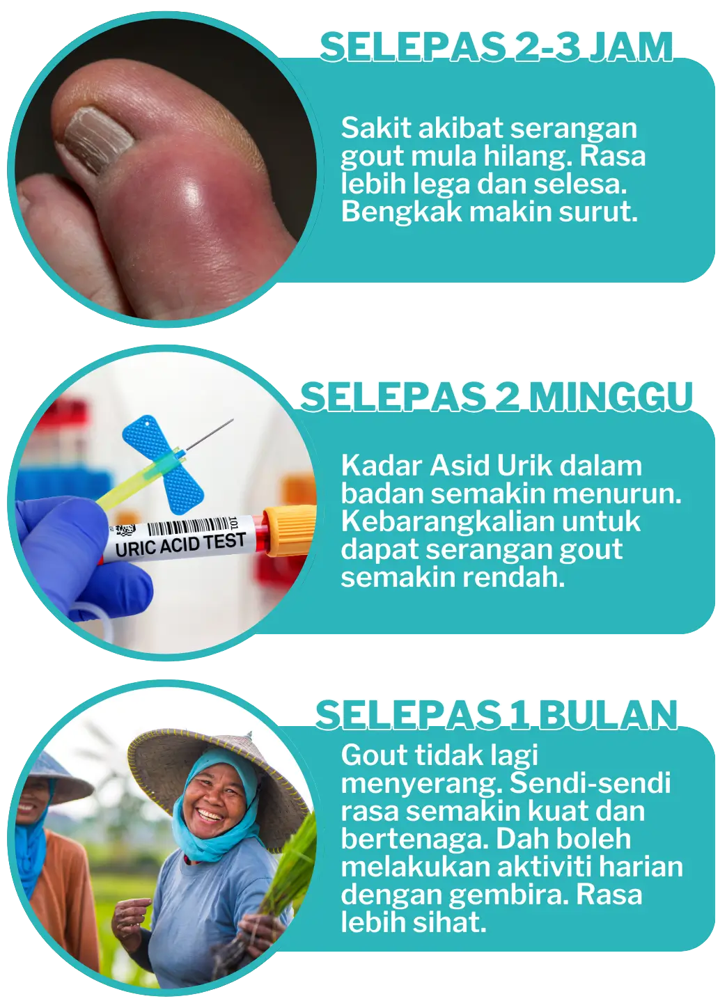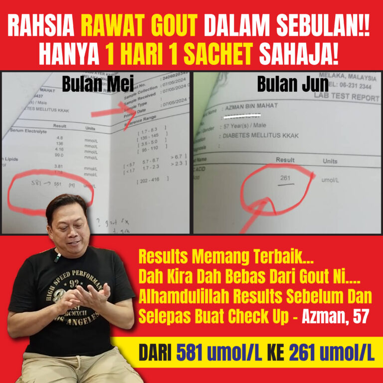Almahdulillah gout saya dah ok bengkak makin surut lepas minum 1 sachet.. raya baru ni pun saya bantai makan macam-macam dah tak datang sakit lagi tu – Encik Azmi
