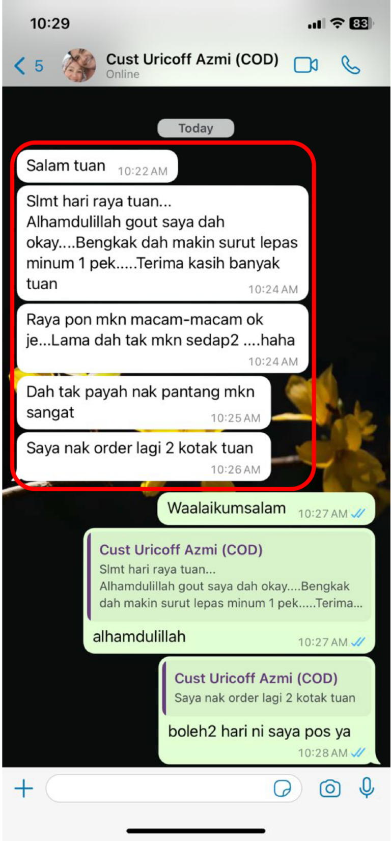 Almahdulillah gout saya dah ok bengkak makin surut lepas minum 1 sachet.. raya baru ni pun saya bantai makan macam-macam dah tak datang sakit lagi tu -Encik Azmi-