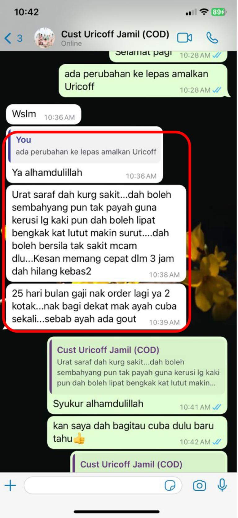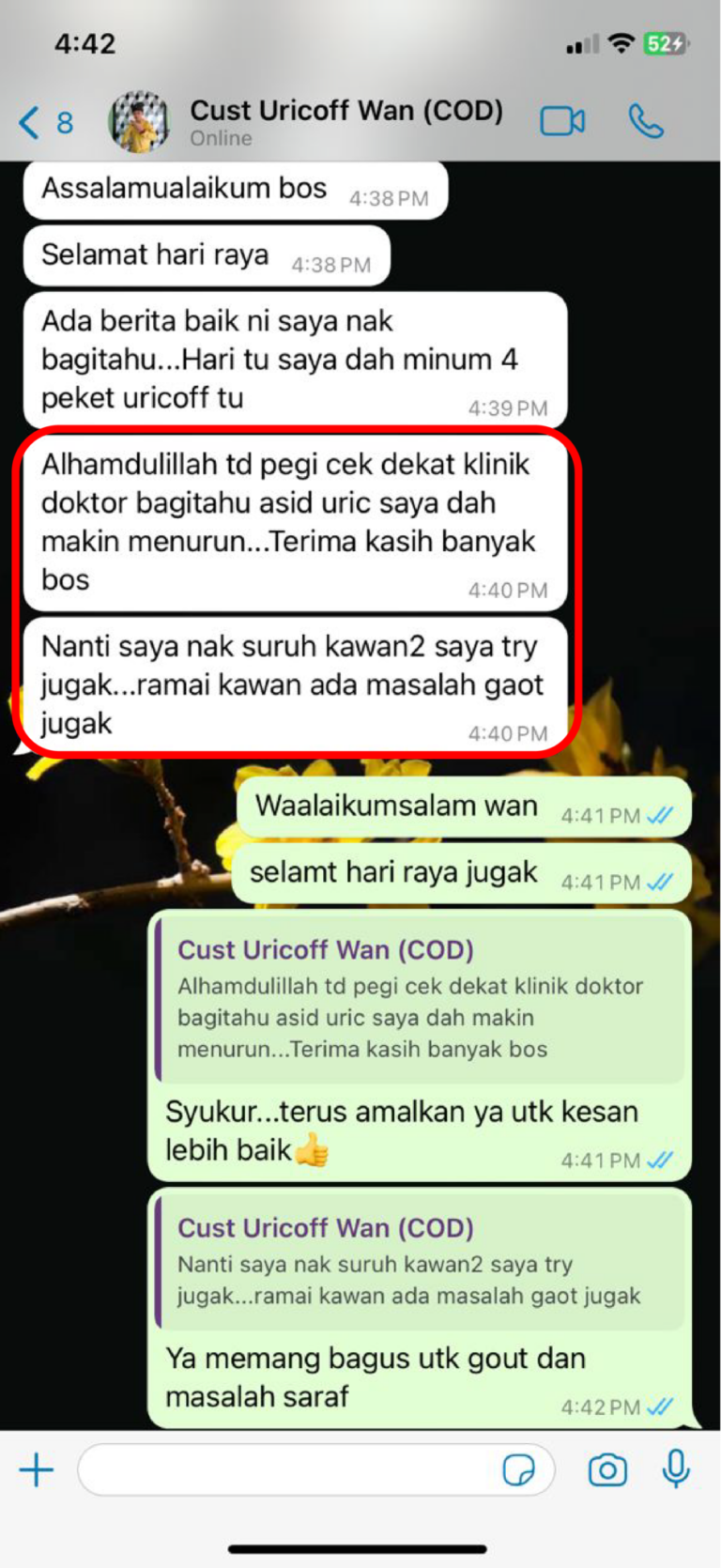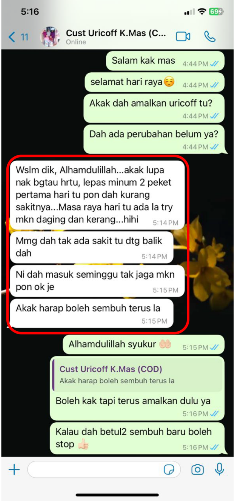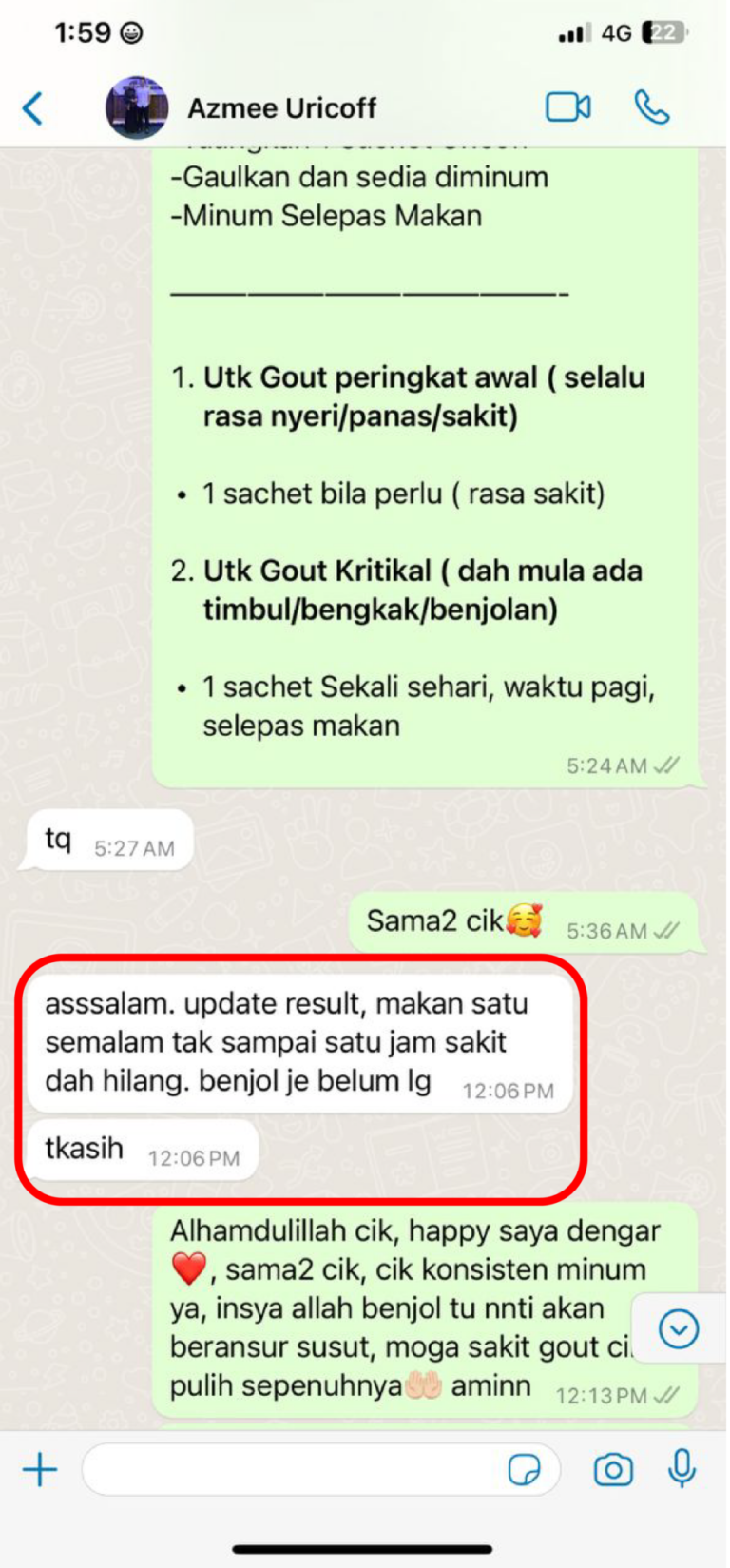 Saya dah minum 4 paket Alhamdulillah cek klinik tadi doktor kata asid uric saya dah makin menurun -Encik Wan 38 Selangor
