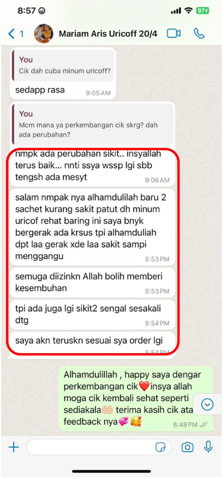 Sukur alhamdulillah saya cek dengan doktor asid uric saya dah makin menurun -Encik Wan-