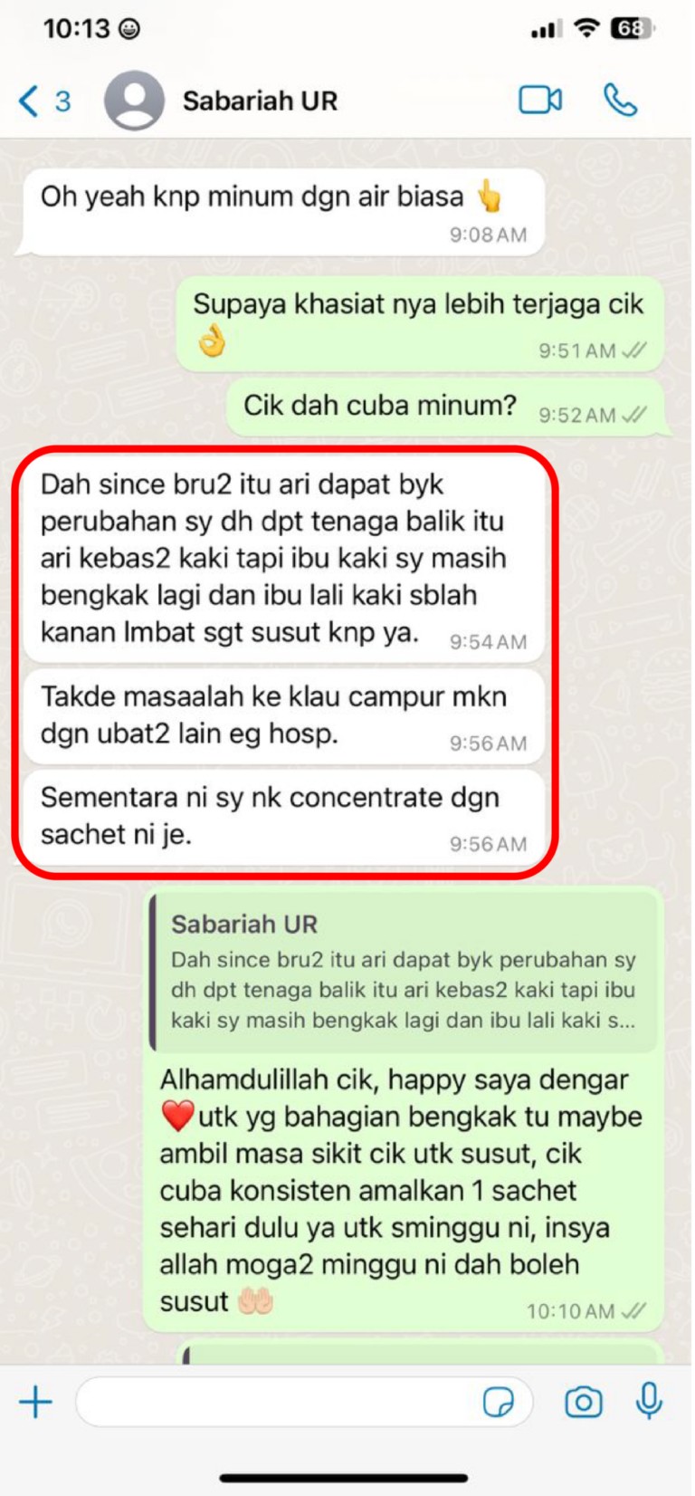 Dah minum alhamdulillah tenaga saya makin pulih kebas ² kaki pun kurang dah -Puan Sabariah-